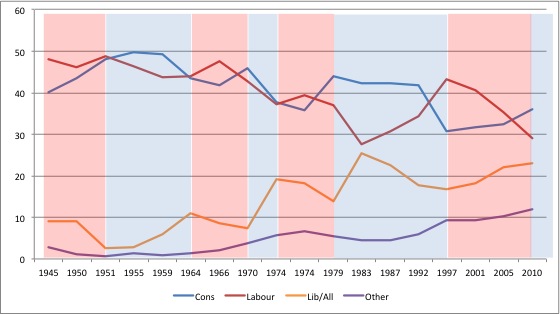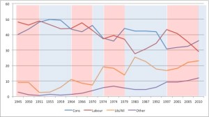 However, things might not be so straightforward. If you look at election results over the past 65 years you see a clear trend towards a more complex party landscape. In the first 25 years of the period Labour and Conservative voters accounted for between 80% and 90% of the popular vote. Since about 1970 though there has been a volatile but clear trend of decline in the percentage of the popular vote  of the two main parties. At the same time the trend in the Liberal vote, whilst similarly erratic, has a clear direction of travel. Votes for “Other” parties have also increased gradually, but consistently. As the parties come closer together eventually a tipping point will occur as the first past the post system no longer magnifies the benefit for Labour and Conservative.
