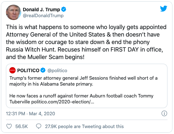 After he had left office the President made clear what he saw as his shortcomings. In essence these were his failure to Protect Trump by closing down the Mueller Inquiry or the “Russia Witch Hunt” as he called it.